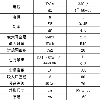 星形聚酯纖維過濾網裝在鋼制過濾艙中,過濾面積20000 cm2,過濾精度 高達3微米 L級別。手動振塵器通過上下垂直搖動能夠振落附著在濾網上的大部分灰塵,有效清潔過濾網從而保持正常的吸塵功效和延長濾網使用壽命。模壓鋁制吸塵口直徑為Ø80 mm,位于過濾網下面,能夠同時吸塵、吸固體和吸水(水量不得超過塵桶容量),無需更換或取出過濾網。