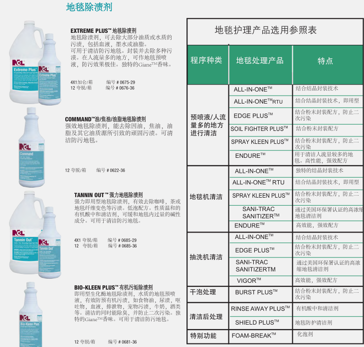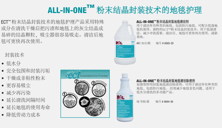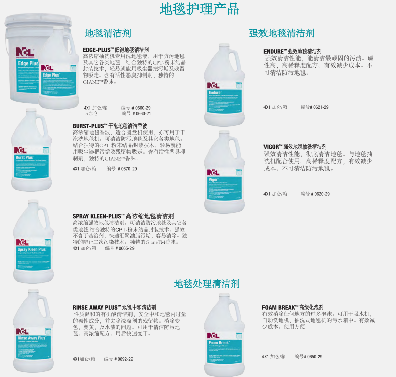 由NCL提供成熟配方產(chǎn)品的地毯護(hù)理解決方案,可以延長(zhǎng)地毯的使用壽命,維護(hù)地毯的靚麗色彩,提供使用者滿意的環(huán)境氛圍和舒適度。NCL提供的全方面的地毯護(hù)理產(chǎn)品包括清潔劑、除漬劑、地毯防護(hù)劑及其它的配套產(chǎn)品,讓使用者在維護(hù)地毯時(shí)可以輕易的使用產(chǎn)品,并有效控制成本。特別是我們的ECT™和EPT™粉末結(jié)晶封裝技術(shù)的防再次污染配方的地毯清潔劑將污垢包裹成一個(gè)松脆的、不粘的粉末殘?jiān)ㄟ^常規(guī)的真空吸塵器很容易去除。使地毯更加美麗干凈。其結(jié)果是延長(zhǎng)了地毯清洗間隔時(shí)間,延長(zhǎng)了地毯保持干凈的時(shí)間。